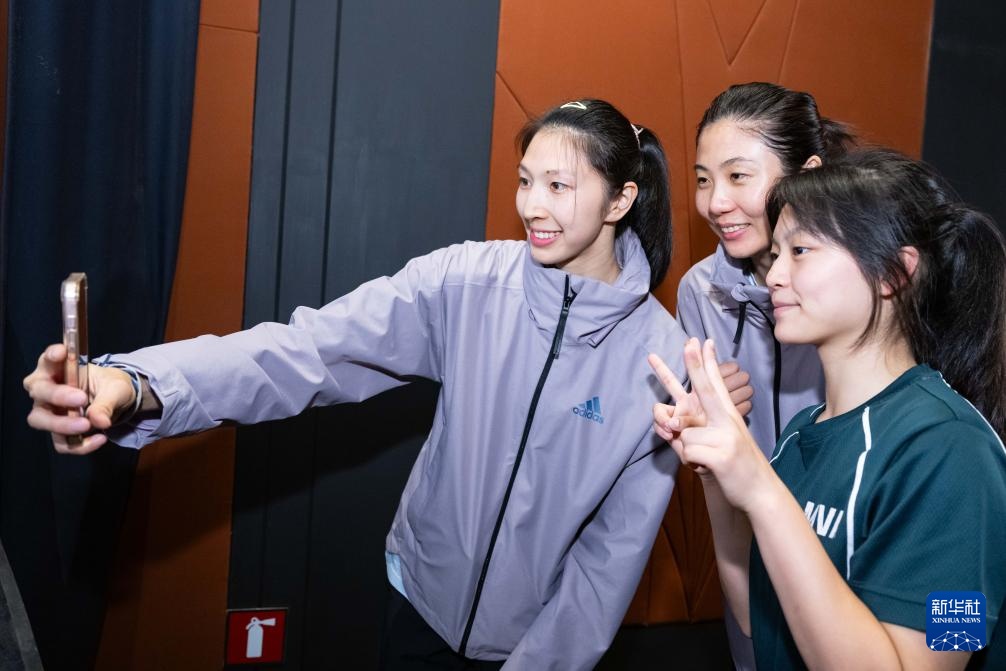 5月24日,中國女排隊員莊宇珊(右二)與青少年球員自拍。新華社記者 張金加 攝
