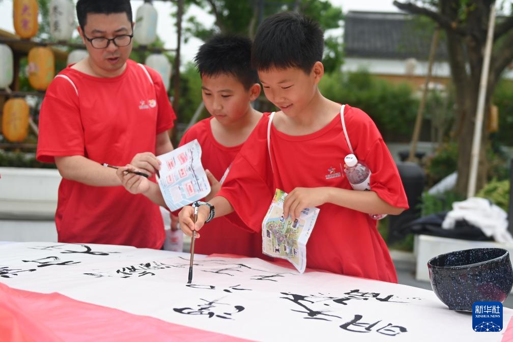 5月25日,參加定向賽的小朋友在比賽中完成寫毛筆字的體驗項目。新華社記者 黃宗治 攝