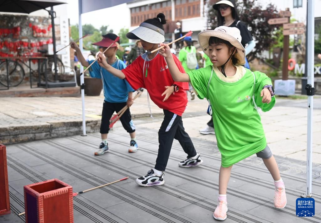 5月25日,參加定向賽的小朋友在比賽中完成投壺體驗活動。新華社記者 黃宗治 攝