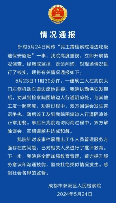 四川成都市雙流區(qū)人民檢察院發(fā)布通報(bào)稱:5月23日11時(shí)30分許,一建筑工人在該院大門左側(cè)機(jī)動(dòng)車道邊席地進(jìn)餐。該院執(zhí)勤保安發(fā)現(xiàn)后,勸其到檢察院圍墻邊人行道陰涼處,與其他工友一起就餐。勸離過程中,雙方因誤會(huì)發(fā)生言語爭(zhēng)執(zhí),隨后該工友到該院圍墻邊人行道陰涼處正常用餐。事后在該院走訪問詢過程中,雙方解除誤會(huì),互相道歉并達(dá)成和解。