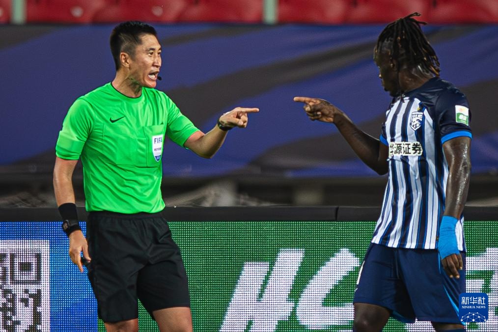5月25日,武漢三鎮(zhèn)隊球員羅馬里奧(右)在比賽中與主裁判馬寧交流。新華社記者 肖藝九 攝