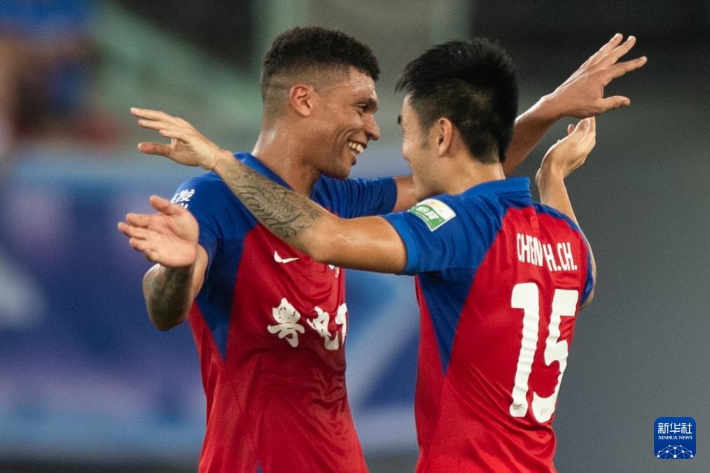5月25日,梅州客家隊球員莫里斯(左)在比賽后與隊友陳哲超慶祝。新華社記者 肖藝九 攝