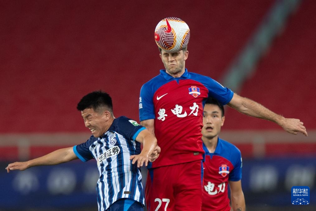 5月25日,梅州客家隊球員科索維奇(中)在比賽中與武漢三鎮(zhèn)隊球員陶強龍爭頂。新華社記者 肖藝九 攝