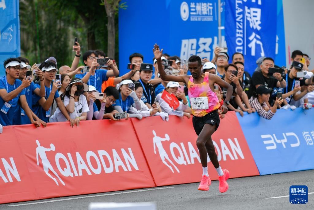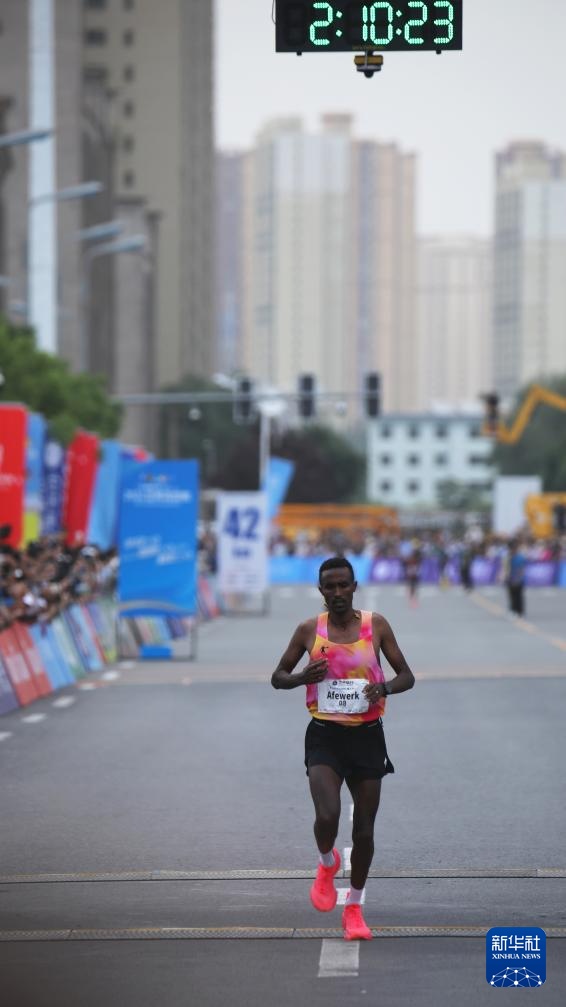 5月26日,埃塞俄比亞選手阿費沃爾克·梅斯芬沖過終點。他以2小時10分23秒的成績獲得男子馬拉松冠軍。新華社記者 張智敏 攝
