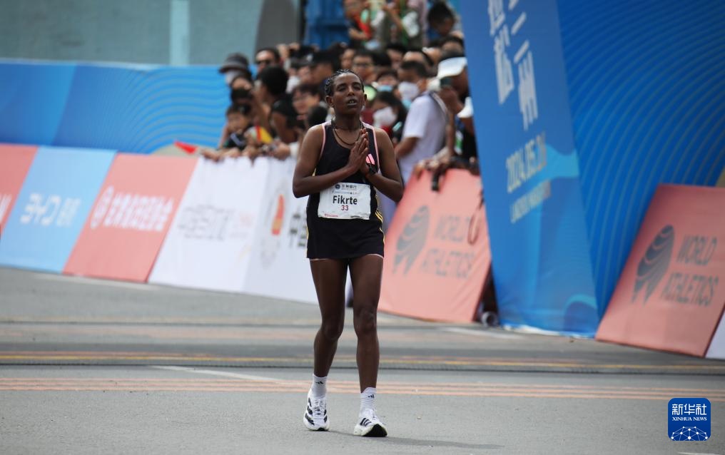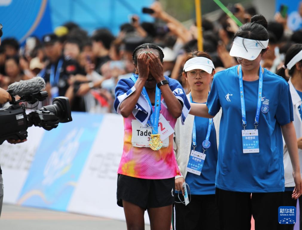 5月26日,埃塞俄比亞選手菲克樂塔·韋雷塔·阿德馬蘇在沖過終點后。她以2小時27分30秒的成績獲得女子馬拉松季軍。新華社記者 張智敏 攝