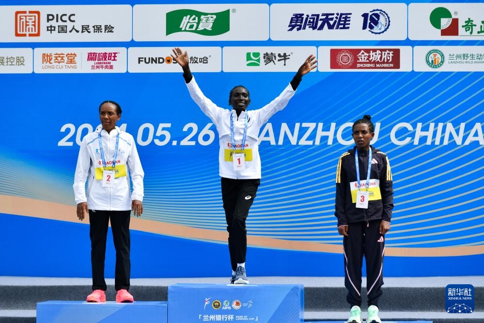 5月26日,女子馬拉松冠軍肯尼亞選手瑪格德琳·馬賽(中)、亞軍埃塞俄比亞選手塔代萊赫·貝克勒·內迪(左)、季軍埃塞俄比亞選手菲克樂塔·韋雷塔·阿德馬蘇在頒獎儀式上。新華社記者 郎兵兵 攝