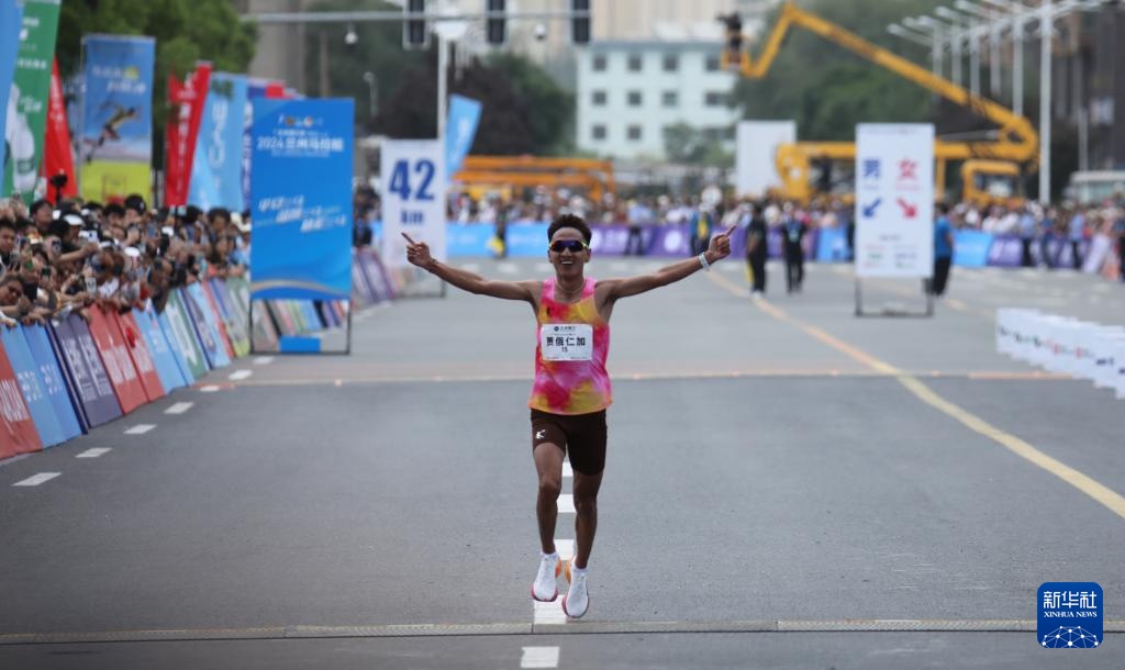 5月26日,中國選手賈俄仁加抵達終點。最終,他以2小時14分33秒的成績獲得男子馬拉松中國籍參賽選手第一名。新華社記者 張智敏 攝