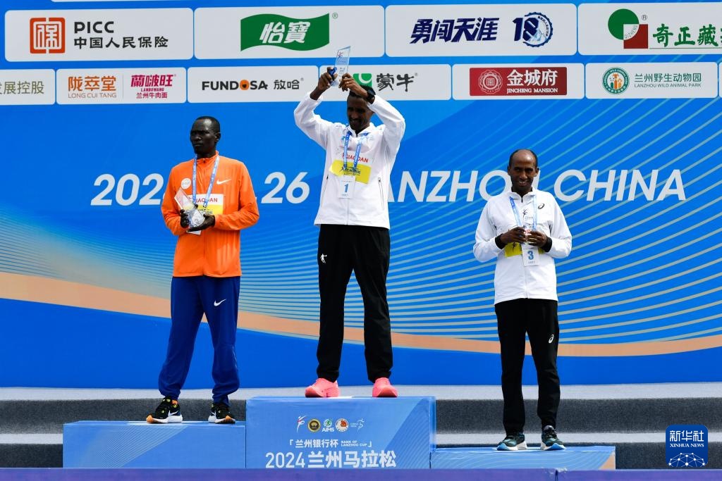 5月26日,男子馬拉松冠軍埃塞俄比亞選手阿費沃爾克·梅斯芬(中)、亞軍肯尼亞選手喬爾·肯博伊·基穆勒(左)、季軍埃塞俄比亞選手安杜阿勒姆·貝萊在頒獎儀式上。新華社記者 郎兵兵 攝