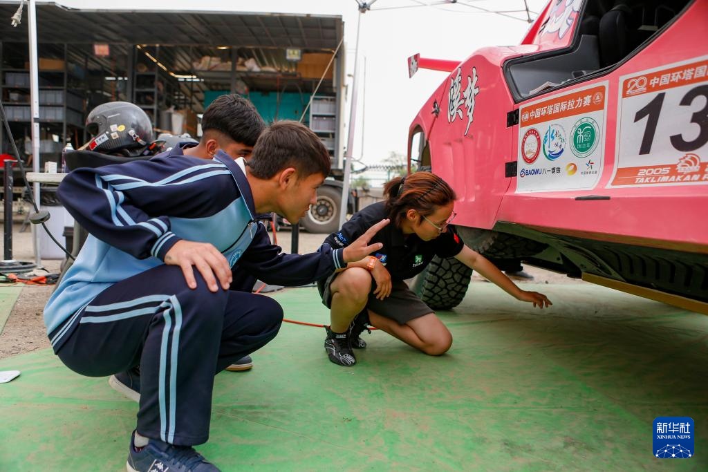 5月27日,陜西云翔俱樂部技師在和田洛浦大營檢修車輛。新華社記者 陳朔 攝