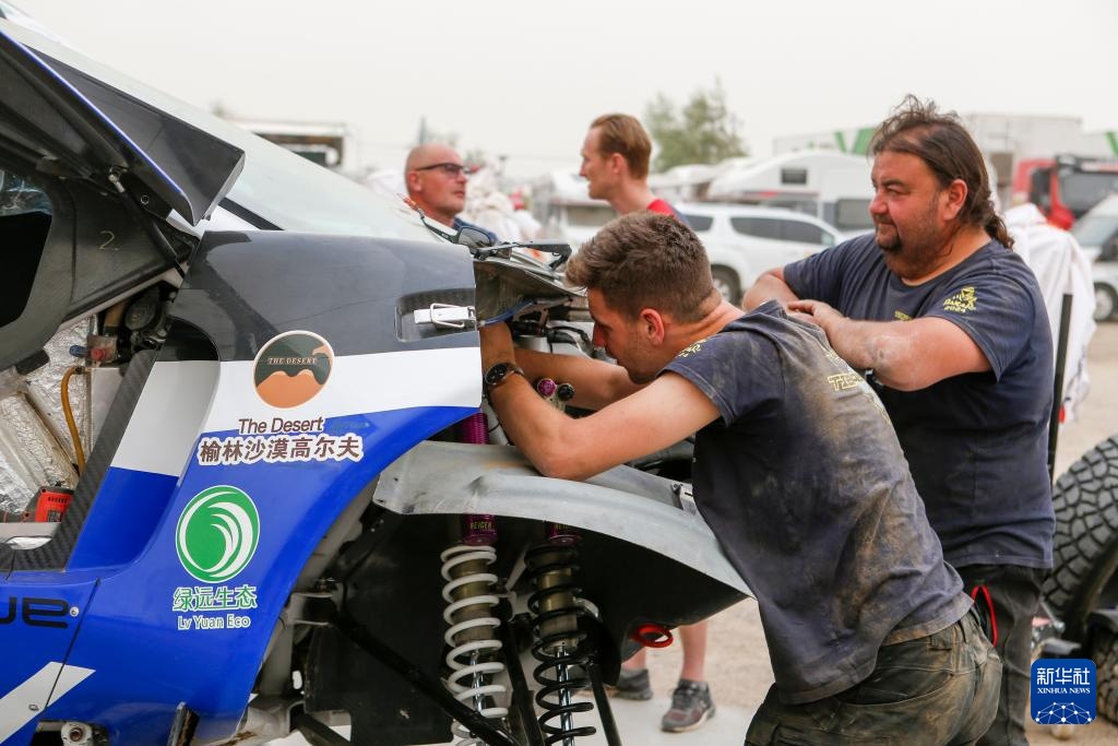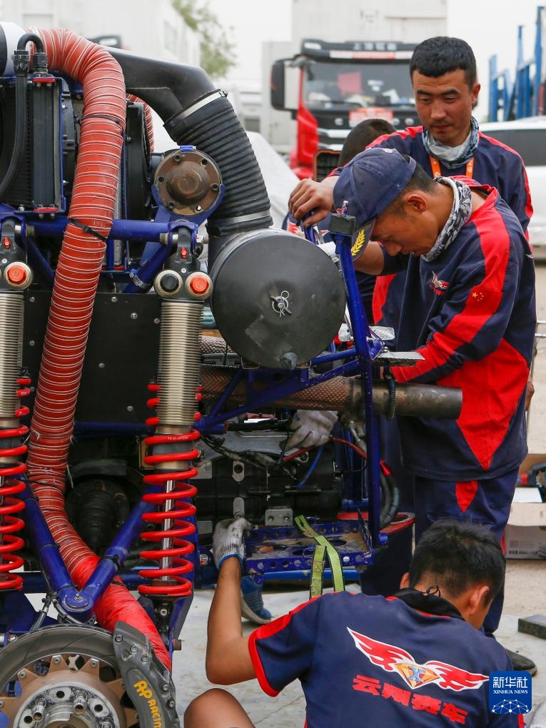 5月27日,陜西云翔汽摩運(yùn)動有限公司技師在和田洛浦大營檢修車輛。新華社記者 陳朔 攝