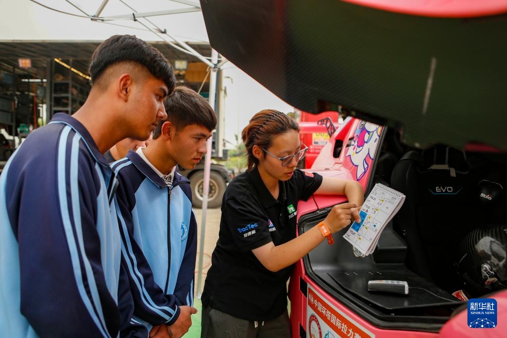 5月27日,河北遷安九江汽摩運(yùn)動俱樂部領(lǐng)航員馬欣(右)在和田洛浦大營為新疆和田洛浦縣中等職業(yè)學(xué)校學(xué)生介紹賽車。新華社記者 陳朔 攝