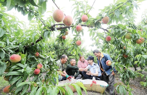 荊門市公安局屈家嶺分局長灘埠派出所民警和社區網格員在屈家嶺管理區龍潭桃園向果農開展預防電信詐騙普法宣傳