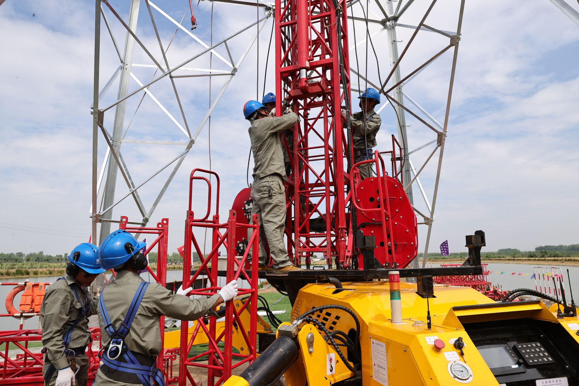 C9桿塔組立施工地點緊鄰魚塘和房屋。施工作業人員應用智能數控技術,設置起吊角度、起吊重量、起吊高度等相關參數?!捌瑝K狀的塔材吊至合適位置,塔上作業人員迅速緊固螺栓,連接塔材,‘積木’便拼好了?!弊鳂I人員張金龍說。