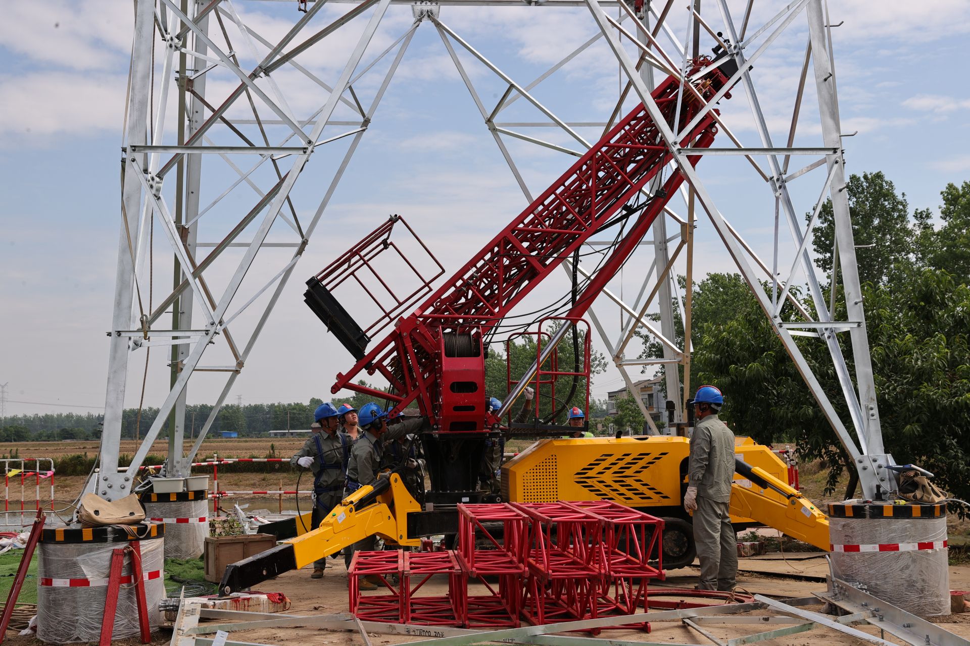 荊楚網(湖北日報網)訊(通訊員 周志勇)“起吊!隨著“隆隆”機器轟鳴聲,機械臂收緊鋼絲繩,將成型的塔材緩緩地吊起。”5月29日上午,在湖北省仙桃市“古河-通??凇?10千伏線路π入仙西工程C9桿塔組立施工現場,湖北荊州供電公司使用新型可移動智能組塔裝置組立鐵塔,不到30分鐘,塔身長高9米。這種智能組塔裝置,讓高空組裝鐵塔成了“高空搭積木”,成片吊裝“預制式”的塔材,平均組立一基鐵塔用時只需一天,比全人工安裝速度快了1倍,施工效率顯著提升。