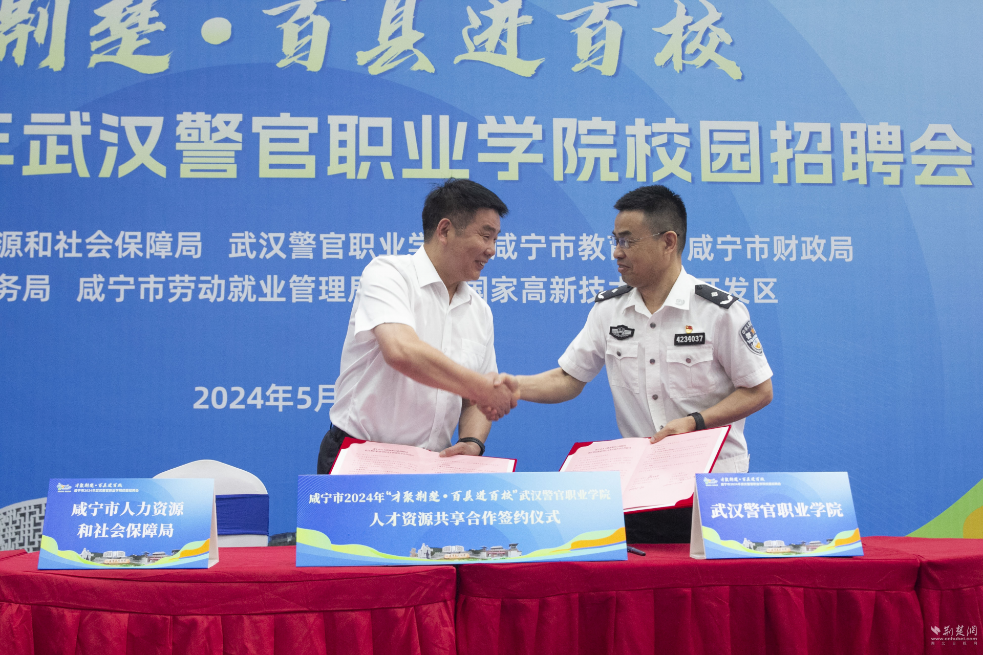 活動現場,咸寧市人社局與武漢警官職業學院簽訂人才資源共享合作協議,就校園招聘、實習實訓、社會實踐等方面開展合作,促進雙方在人才、科研、教學等領域的交流共建,為咸寧市招才引智工作推進搭建良好平臺。