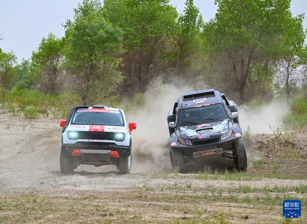 5月29日,北京汽車車隊車手胡紅德、領航員王平(左車)和北京市大興區巨匠應急拉力車隊車手張學峰、領航員陳利民(右車)駕駛賽車在比賽中。新華社記者 陳朔 攝