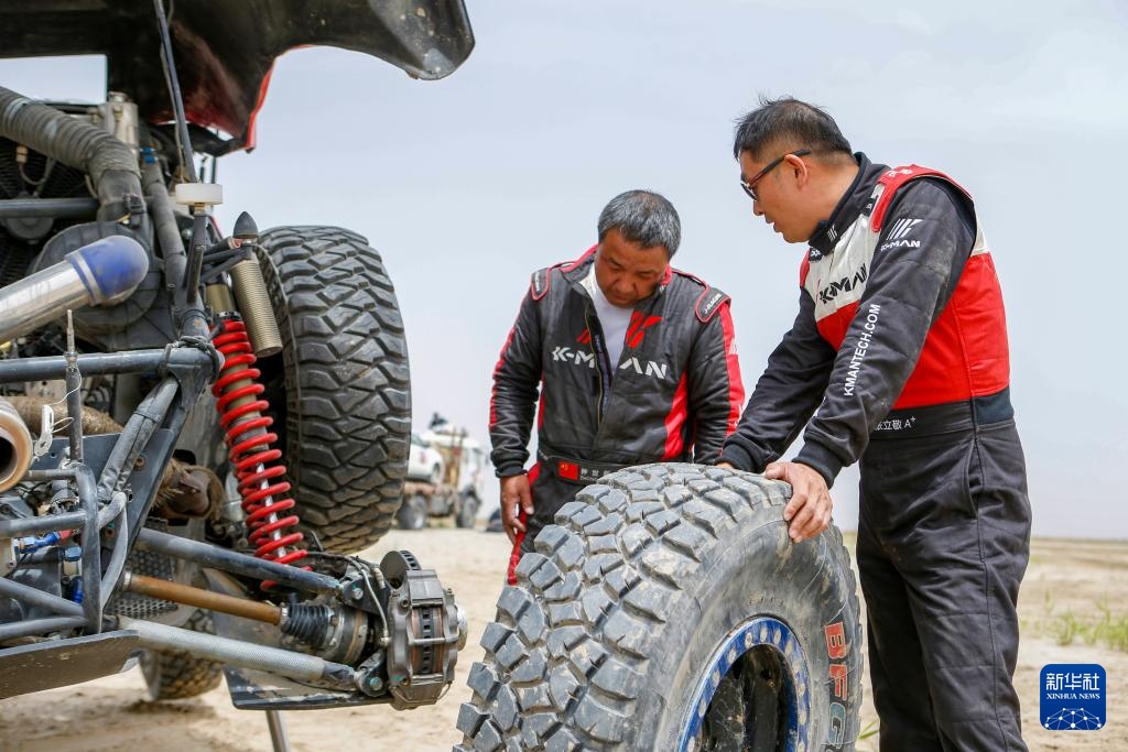 5月29日,K-MAN(中國)DO輪轂硬虎車隊車手張立敬(右)、領航員鐘世新在比賽中翻車后維修車輛。新華社記者 陳朔 攝
