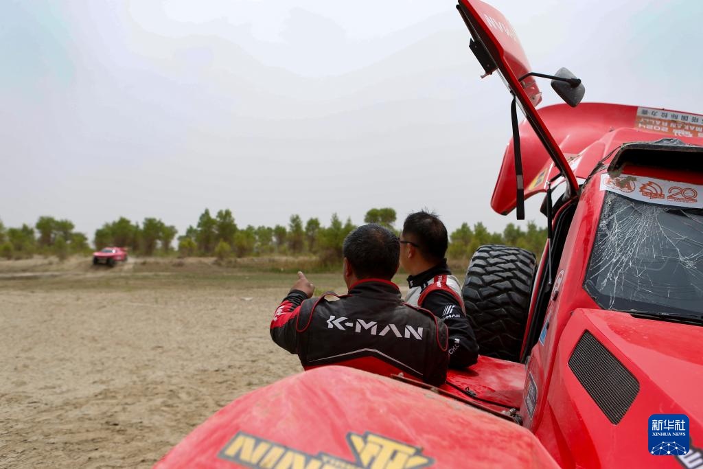 5月29日,K-MAN(中國)DO輪轂硬虎車隊車手張立敬、領航員鐘世新在比賽中翻車后等待救援。新華社記者 陳朔 攝