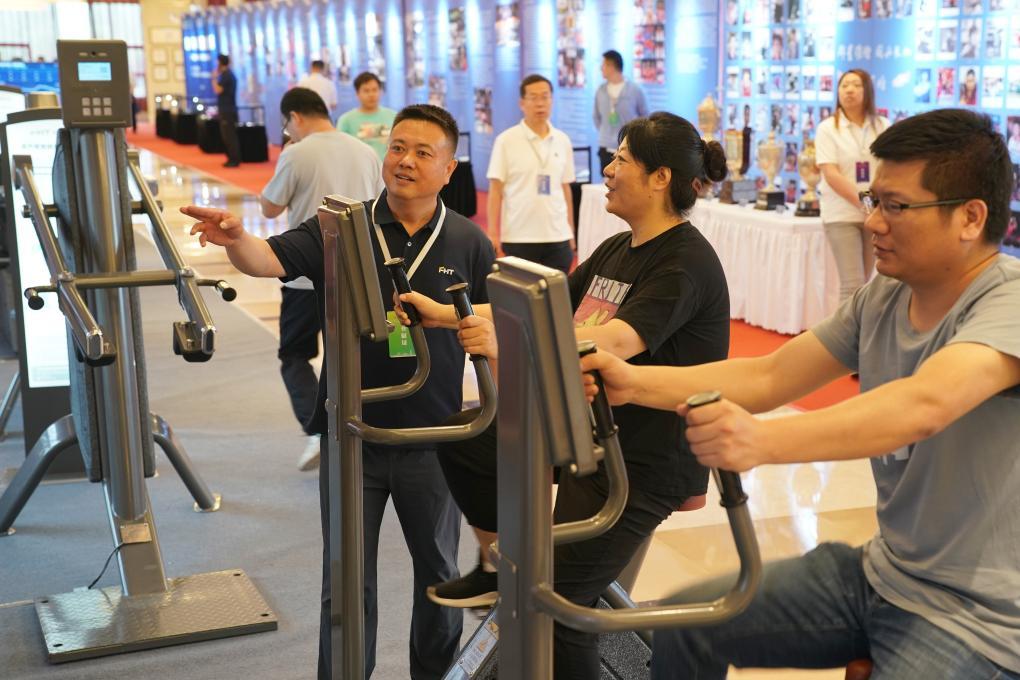 5月29日,與會人員在現場體驗智能健身器材。新華社記者 邵瑞 攝