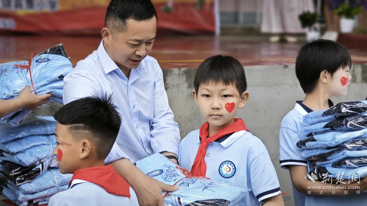 活動在莊嚴的升旗儀式中拉開序幕,下辛店、孝感西管理所“緣夢、孝熙”志愿隊有幸參與了新少先隊員的入隊儀式。伴隨著雄壯的出旗曲,三名少先隊員邁著整齊的步伐,高舉著鮮艷的少先隊隊旗走上舞臺,全體少先隊員高聲齊唱少先隊隊歌——《我們是共產主義接班人》,五年級的老隊員為新入隊的同學佩戴了紅領巾。“緣夢、孝熙”志愿者還在現場為學生們一一送上愛心校服,并向孩子們表達節日的祝福和誠摯的關懷,鼓勵他們要熱愛祖國、自信自強、求知奮進,做新時代中國特色社會主義事業的接班人。
