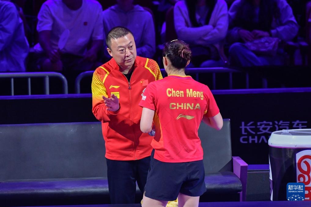 5月30日,陳夢(右)與教練馬琳在比賽間隙交流。新華社記者 張子彧 攝