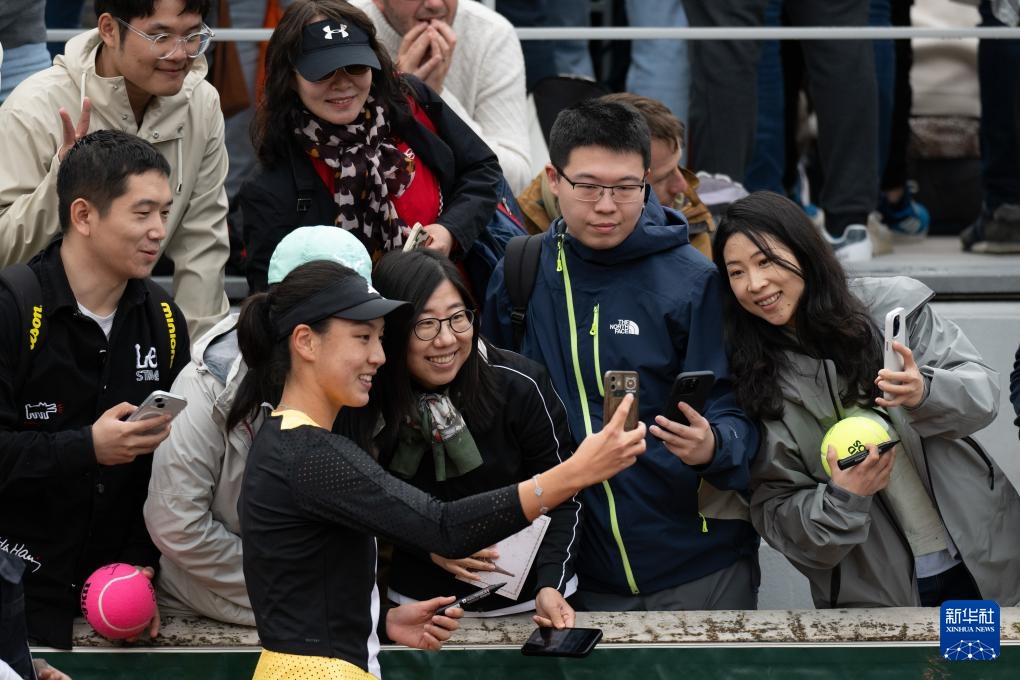 5月30日,王欣瑜(左前)在比賽后與球迷合影。新華社記者 孟鼎博 攝