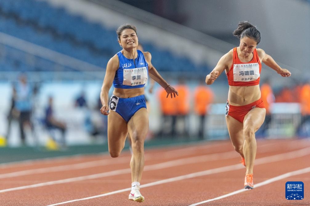 5月28日,湖北彈射者隊選手李賀(左)、陜西隊選手馮璐璐在比賽中沖線。最終,馮璐璐獲得第二名。新華社記者 黃偉 攝