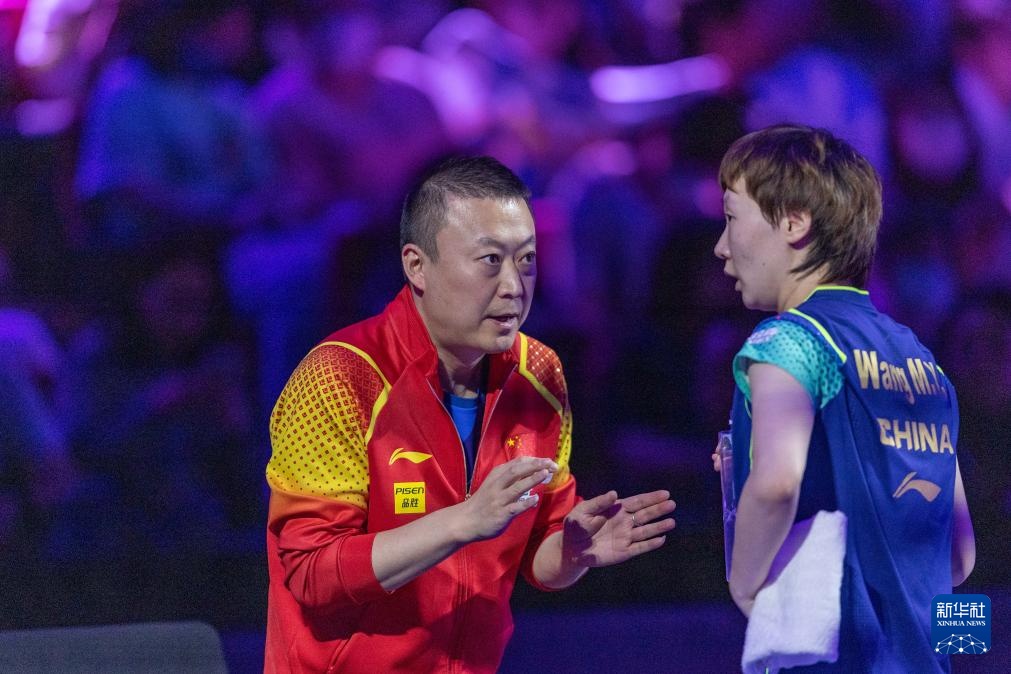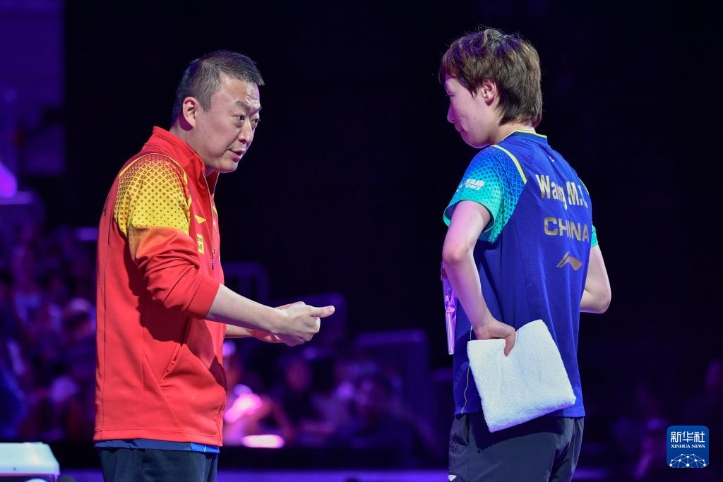 5月31日,王曼昱(右)與教練馬琳在比賽間隙交流。
