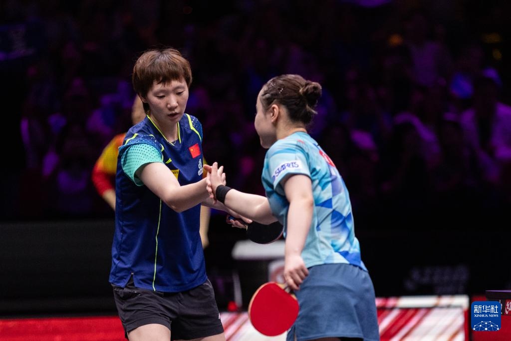 5月31日,王曼昱(左)與伊藤美誠在比賽結束后相互致意。