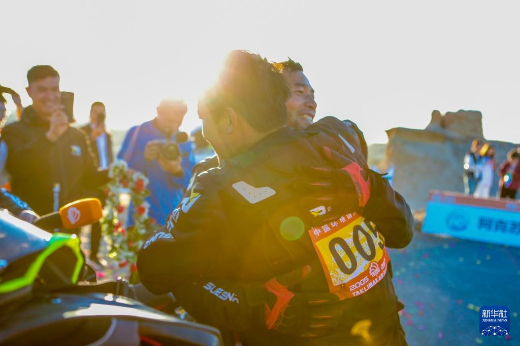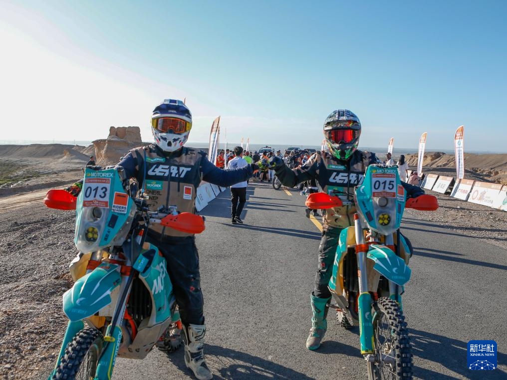 6月1日,MOTOREX-KTM騎士學院車隊中國車手連歡(左)和隊友中國車手湯楊虎在完賽后碰拳慶祝。新華社記者 陳朔 攝