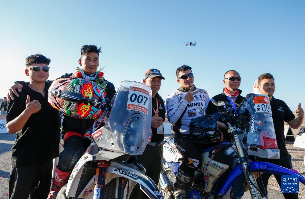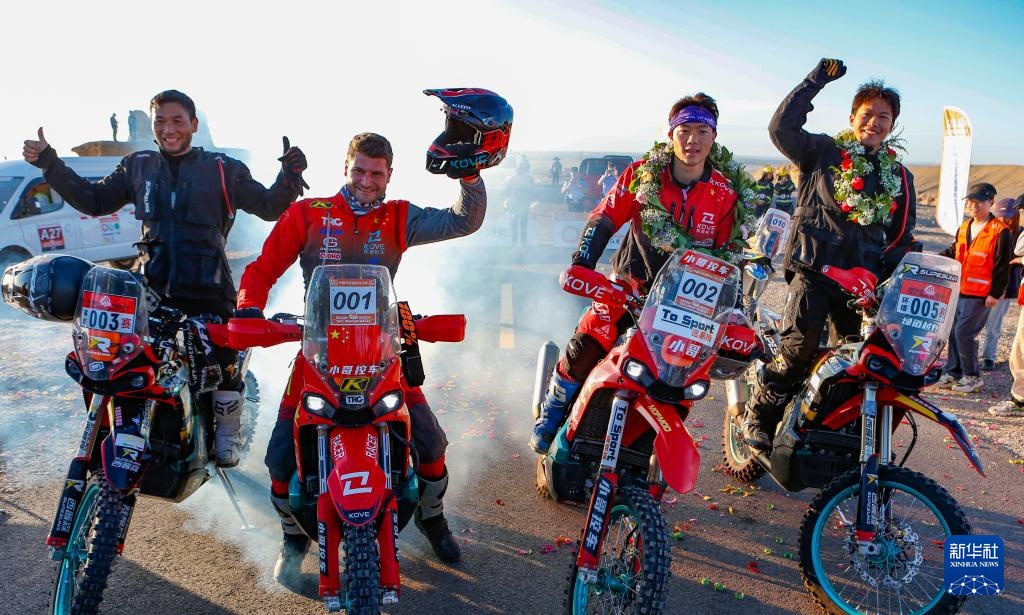 6月1日,西普森輪胎拉力車隊中國車手方明集(左一)、凱越機車越野車隊法國車手內爾斯·泰里克(左二)、凱越機車越野車隊中國車手鄧連松(右二)和西普森輪胎拉力車隊中國車手方響量在完賽后慶祝。新華社記者 陳朔 攝