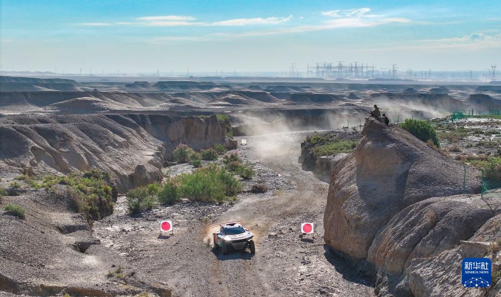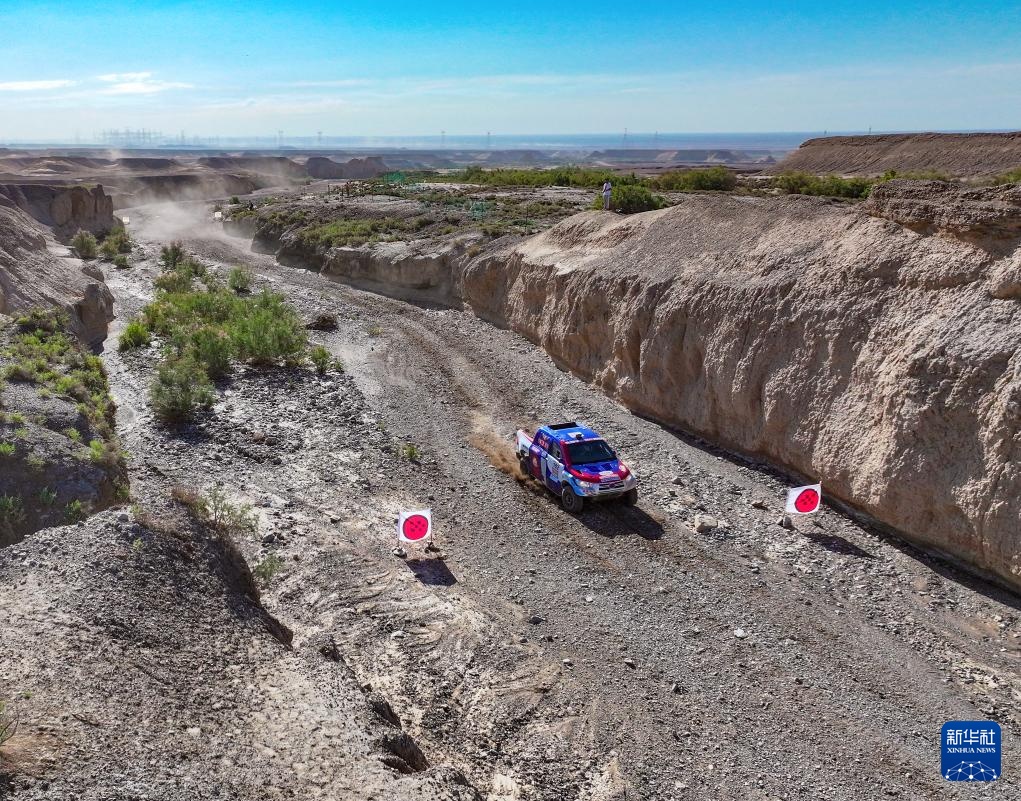 6月1日,陜西云翔車隊中國車手劉彥貴、領航員付昕明駕駛賽車經過沖刺點(無人機照片)。新華社記者 陳朔 攝