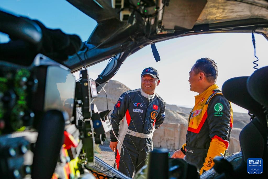 6月1日,陜西云翔俱樂部中國領航員廖岷(右)和赤峰市明源實業CR6賽車隊中國車手張惠軍在完賽后交流。新華社記者 陳朔 攝