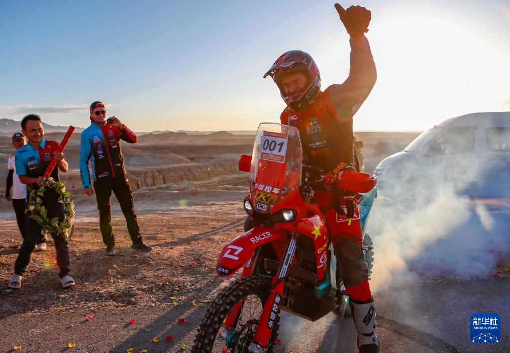 6月1日,凱越機車越野車隊法國車手內爾斯·泰里克到達終點后慶祝。他摘得摩托車組全場頭名。新華社記者 陳朔 攝