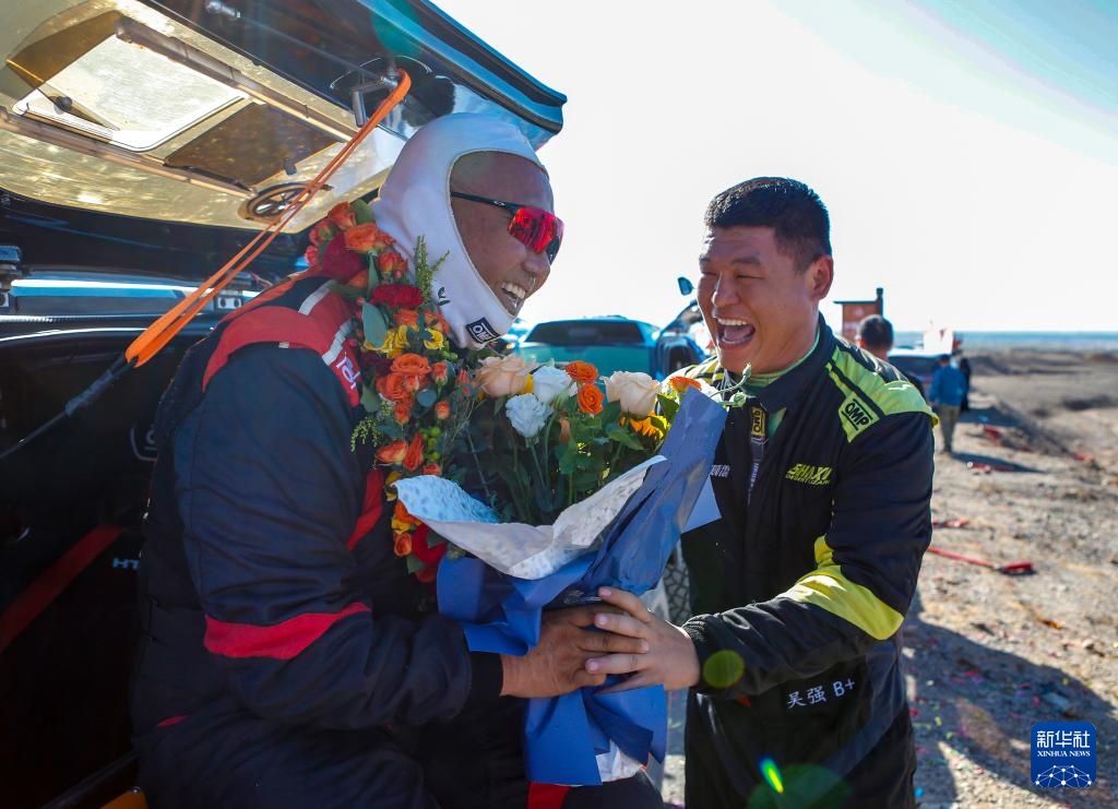 6月1日,沙蜥減震器車隊中國車手吳強(右)為重慶中汽越野寧夏南方商城賽車隊中國車手楊紅兵獻花。新華社記者 陳朔 攝