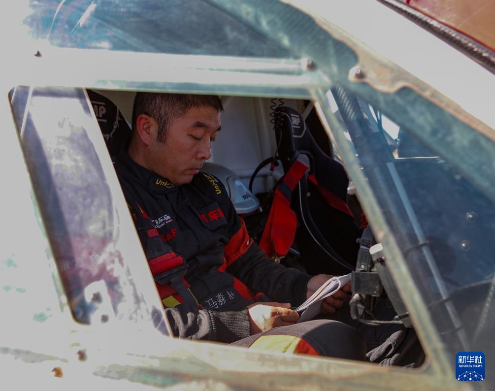 6月1日,多耐減震山西越界賽車俱樂部中國領航員馬淼在完賽后翻看路書。新華社記者 陳朔 攝
