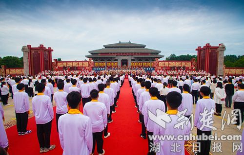 共拜始祖。全體肅立,面向炎帝神農大殿內圣像,鞠躬行施拜禮。