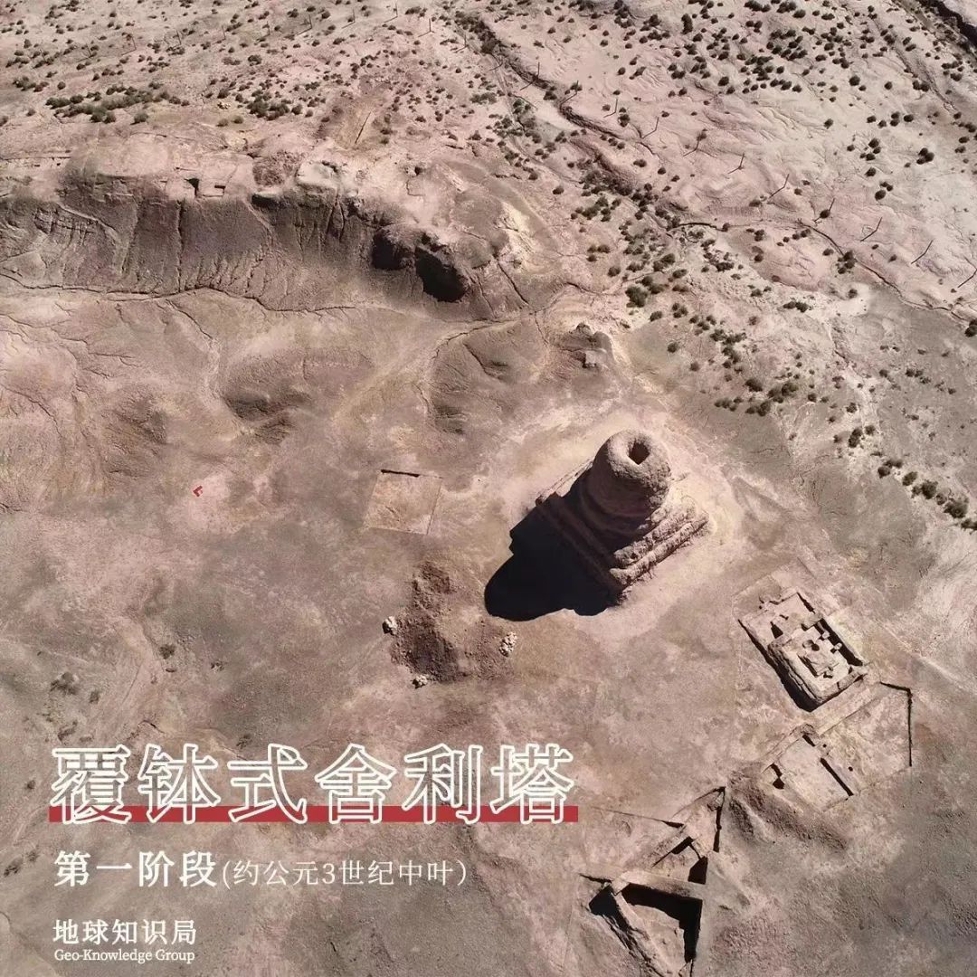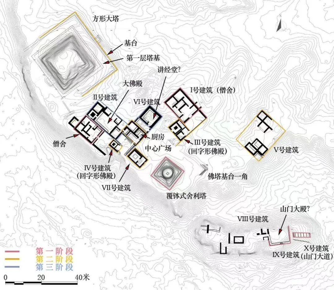 覆缽式舍利塔是遺址最早修建的建筑之一,位于建筑區的中心,以其為基點,佛寺于北、東、南三面陸續增建和擴建,大體可分為早期、中期、晚期3個階段。