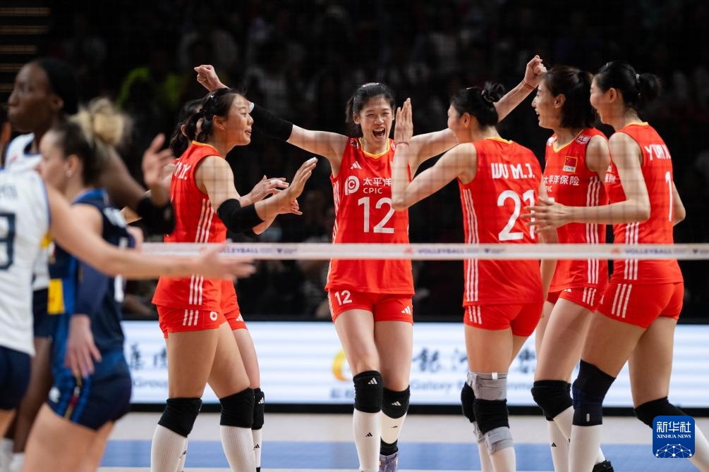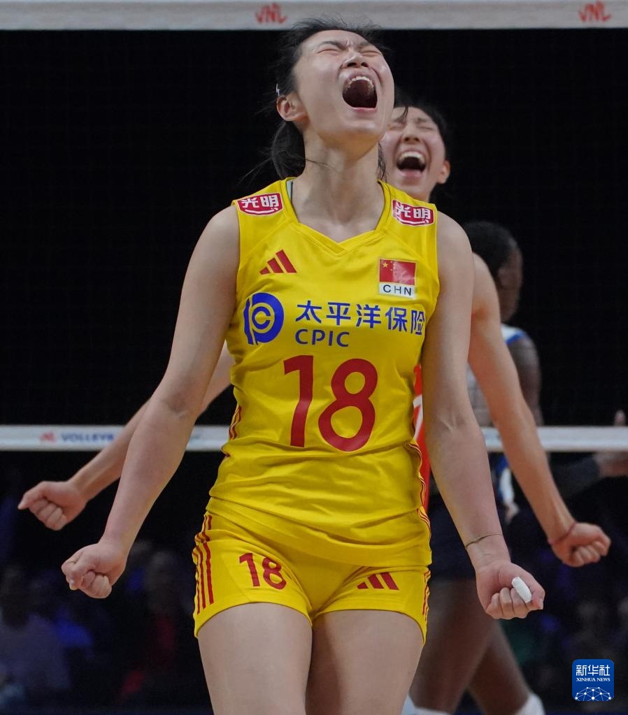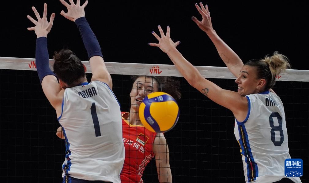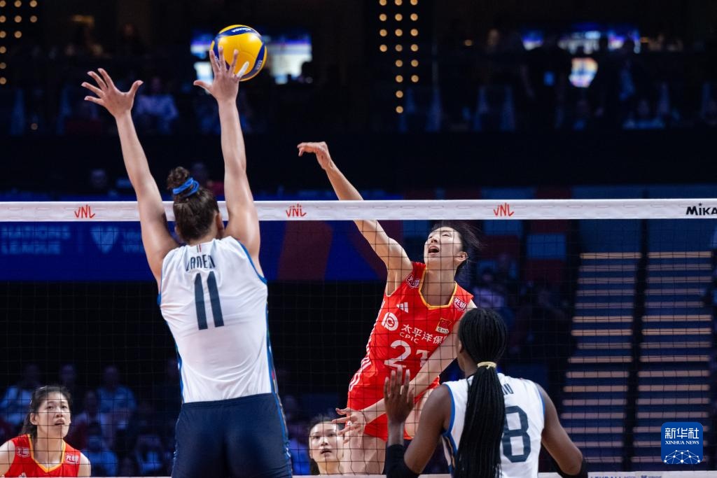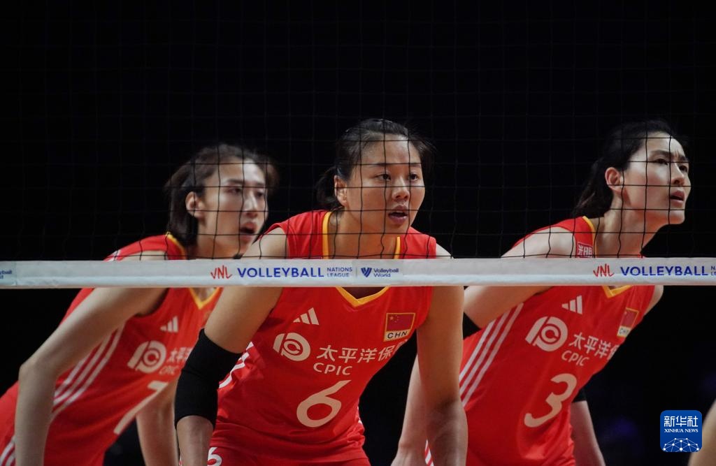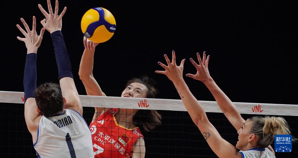 6月2日,中國隊球員吳夢潔(中)在比賽中扣球。新華社記者 張金加 攝