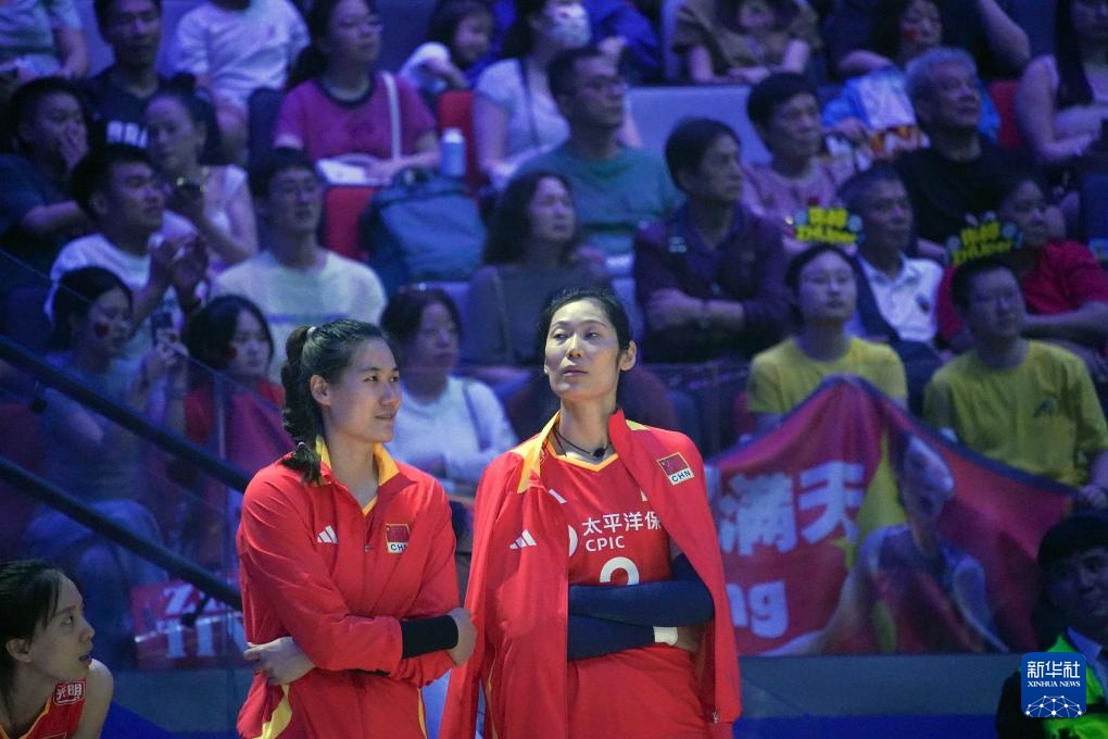 6月2日,中國隊球員朱婷(右)在場邊觀賽。新華社記者 呂小煒 攝