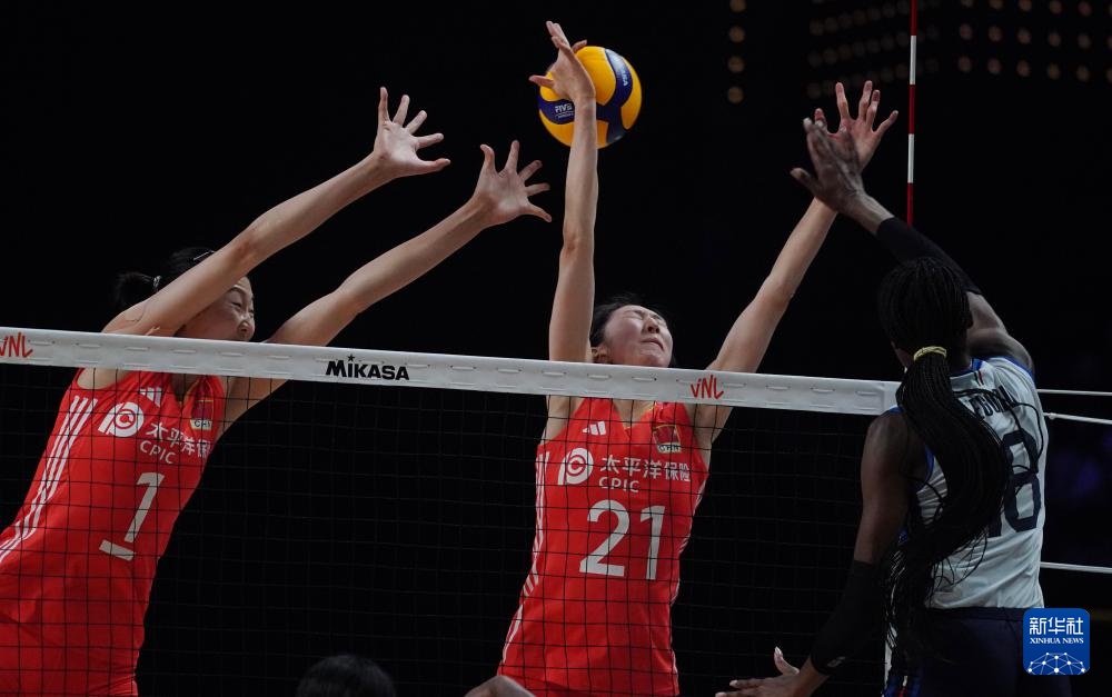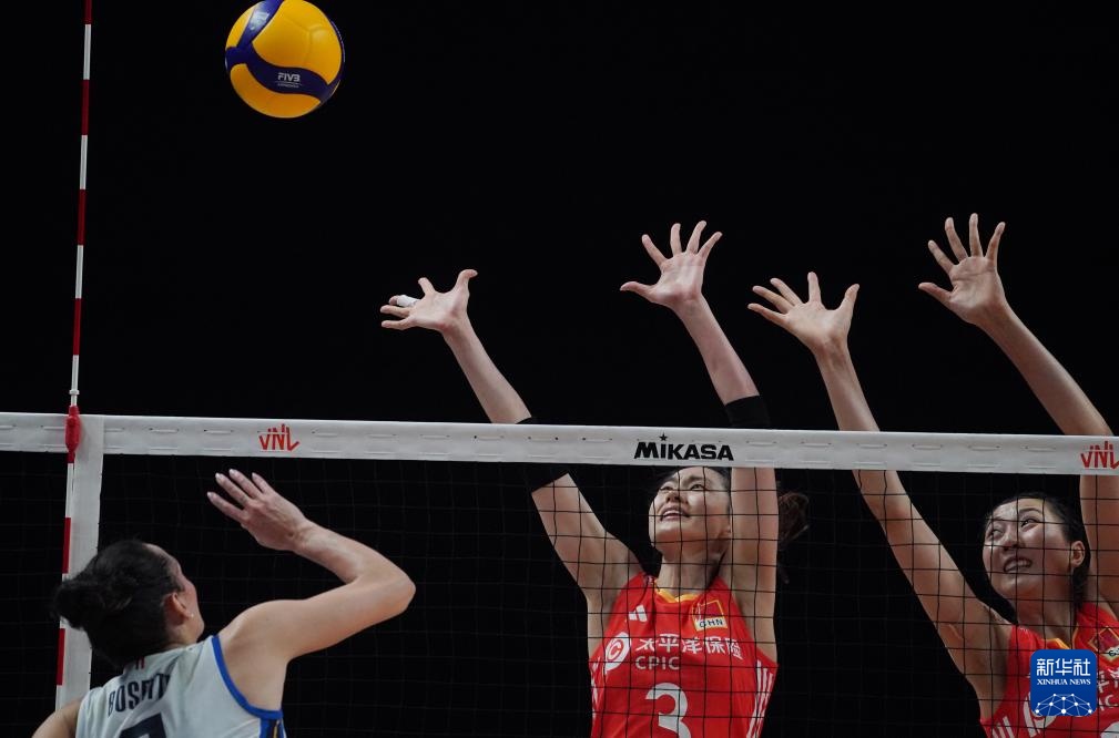 6月2日,中國隊球員袁心玥(左)和吳夢潔(中)在比賽中攔網。新華社記者 呂小煒 攝