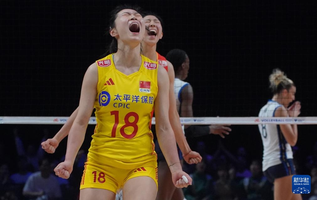 6月2日,中國隊球員在比賽中慶祝得分。新華社記者 張金加 攝