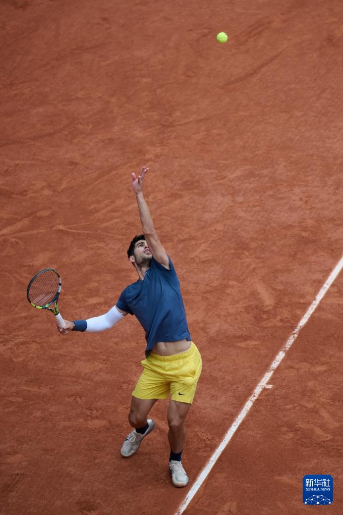 6月2日,阿爾卡拉斯在比賽中發(fā)球。新華社記者 孟鼎博 攝