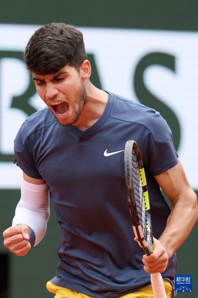 6月2日,阿爾卡拉斯在比賽中慶祝得分。新華社記者 孟鼎博 攝