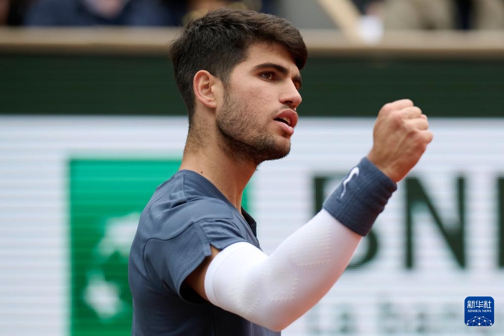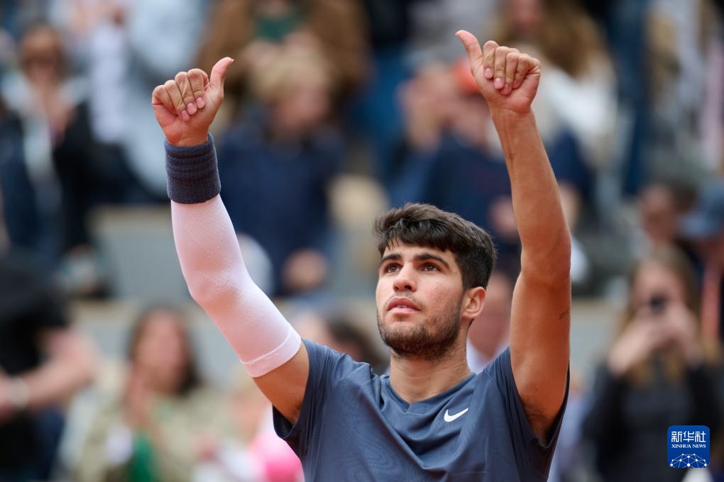 6月2日,阿爾卡拉斯在比賽后慶祝勝利。新華社記者 孟鼎博 攝
