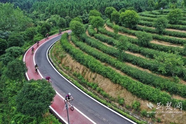 在汀泗橋鎮黃荊塘村,一壟壟茶樹將小山包覆蓋,紅黑相間的道路蜿蜒綠海中,騎行者身影不時閃過。