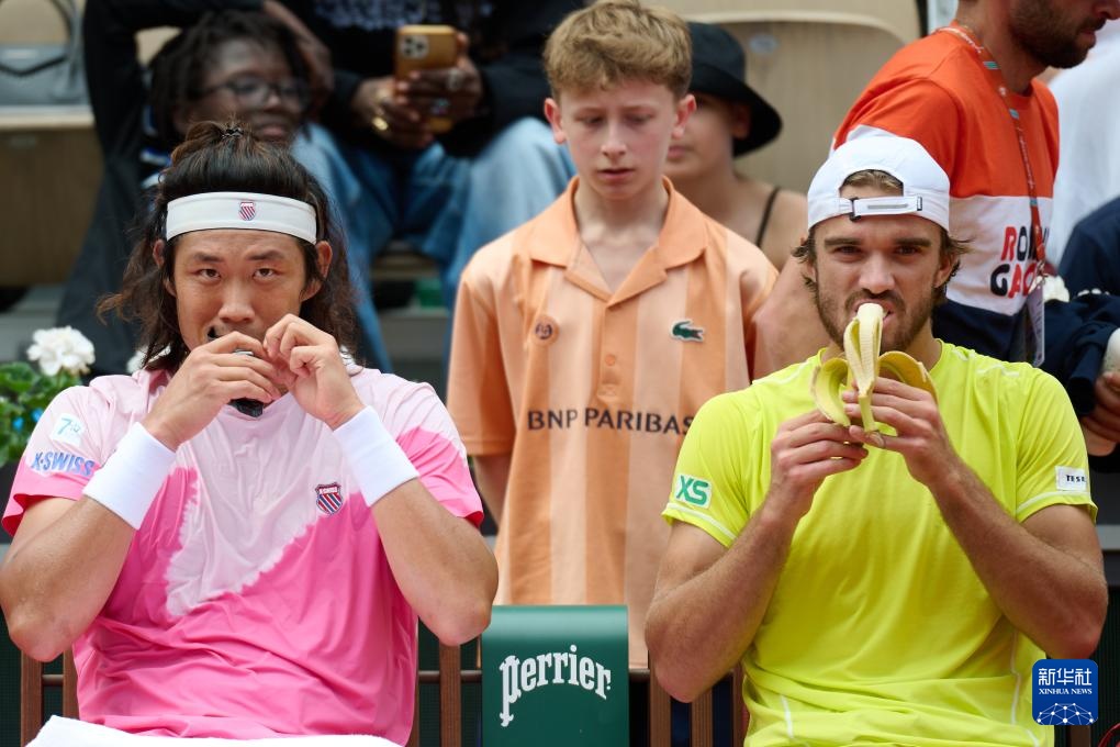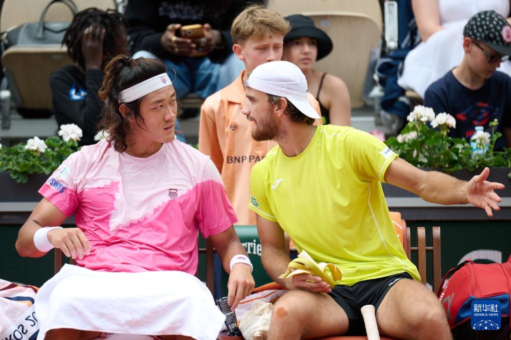 6月4日,張之臻(左)/馬哈奇在比賽間隙。新華社記者 孟鼎博 攝