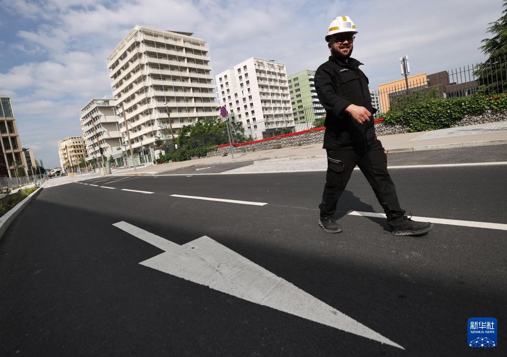 6月4日,一名工作人員經過巴黎奧運村和殘奧村建筑。新華社記者 高靜 攝