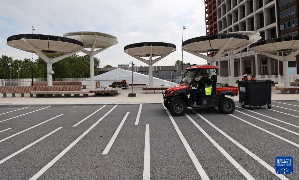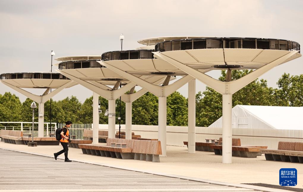 6月4日,在巴黎奧運村和殘奧村,工作人員經過一處用于凈化空氣的裝置。新華社記者 高靜 攝