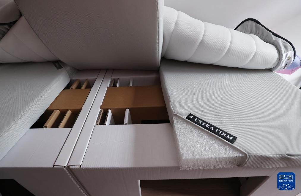 這是6月4日在巴黎奧運村和殘奧村內拍攝的可回收床架和床墊。新華社記者 高靜 攝